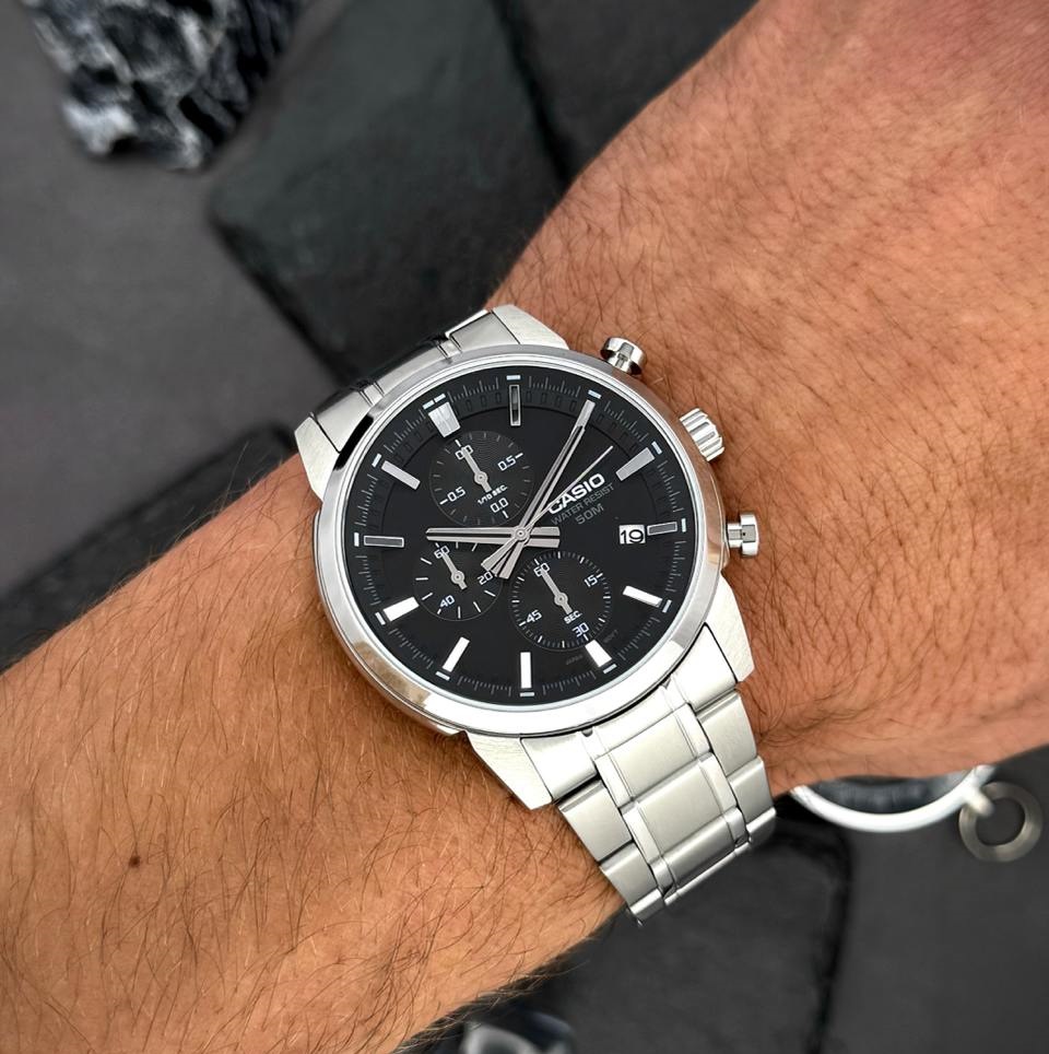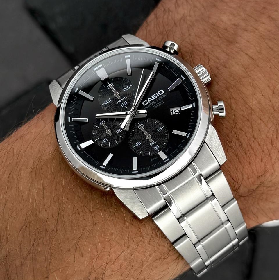 The CASIO MTP-E510D-1A1VDF is a watch where understated classic design meets modern precision and everyday functionality. Its deep black dial conveys order, with silver hands and markers standing out clearly, highlighting the watch’s confident character. The date window integrates seamlessly into the layout, offering practicality without distraction.