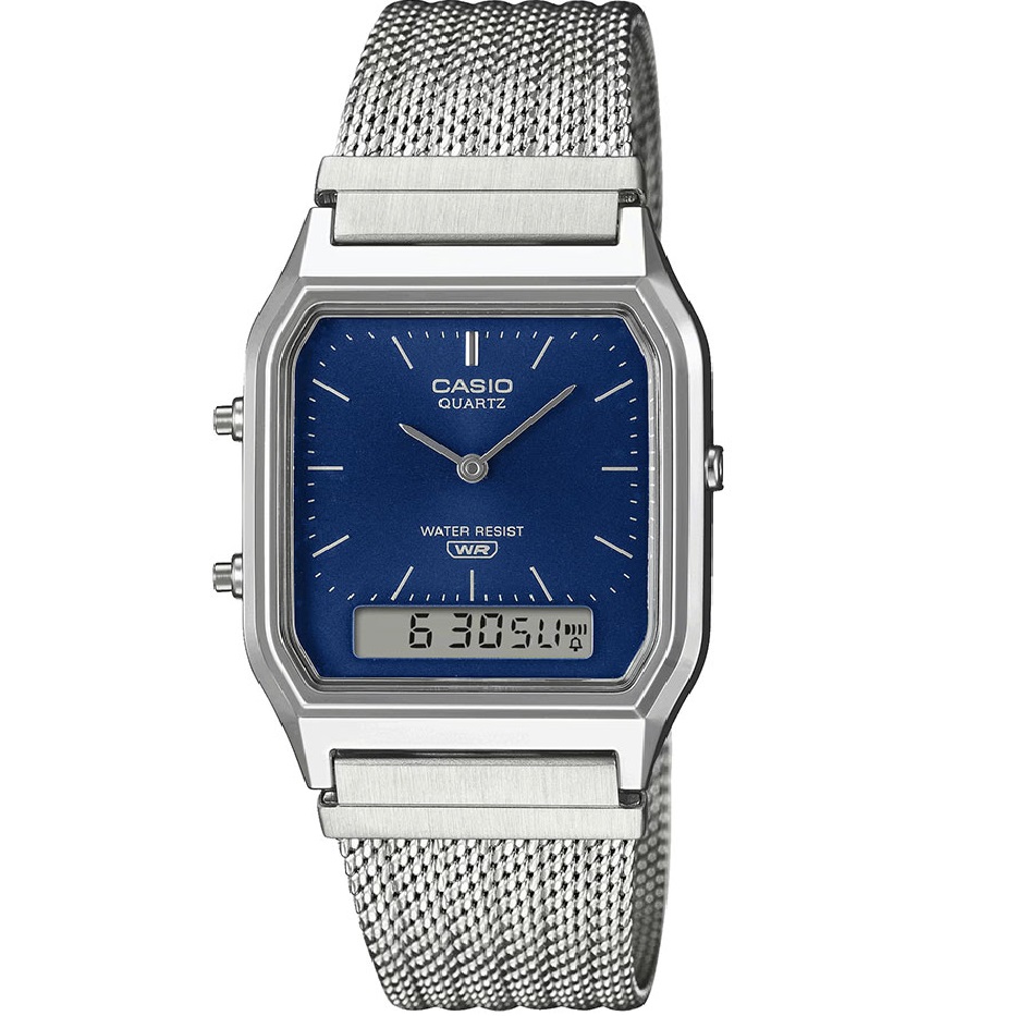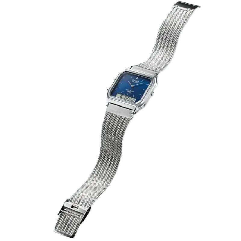 Корпус у компактному ретро-форматі та стальний браслет міланського плетіння надають годиннику легкість, комфорт та винтажний характер, підкреслюючи витонченість моделі та забезпечуючи зручну посадку на зап’ясті. Циферблат з аналоговою та цифровою зонами залишається добре читабельним і збалансованим за дизайном. Розміри корпусу 29,8×38,8×8,1 мм роблять годинник акуратним і ненав’язливим, ідеальним для щоденного носіння. Водозахист WR30 (3 атм) захищає модель від бризок та дощу, забезпечуючи надійність у побутових умовах.
