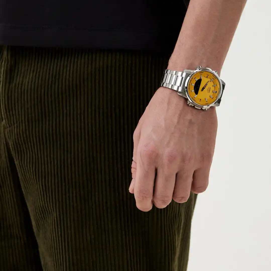 CASIO AMW-880D-9AVDF — це поєднання елегантного металу й тепла золотистого циферблата, який одразу привертає увагу. Його насичений медово-золотий відтінок виглядає як відблиск сонця на сталі, створюючи особливу атмосферу тепла й впевненого стилю. Сталевий корпус і браслет додають відчуття міцності, а комбінація аналогових стрілок і цифрового дисплея створює гармонію класики та сучасності.