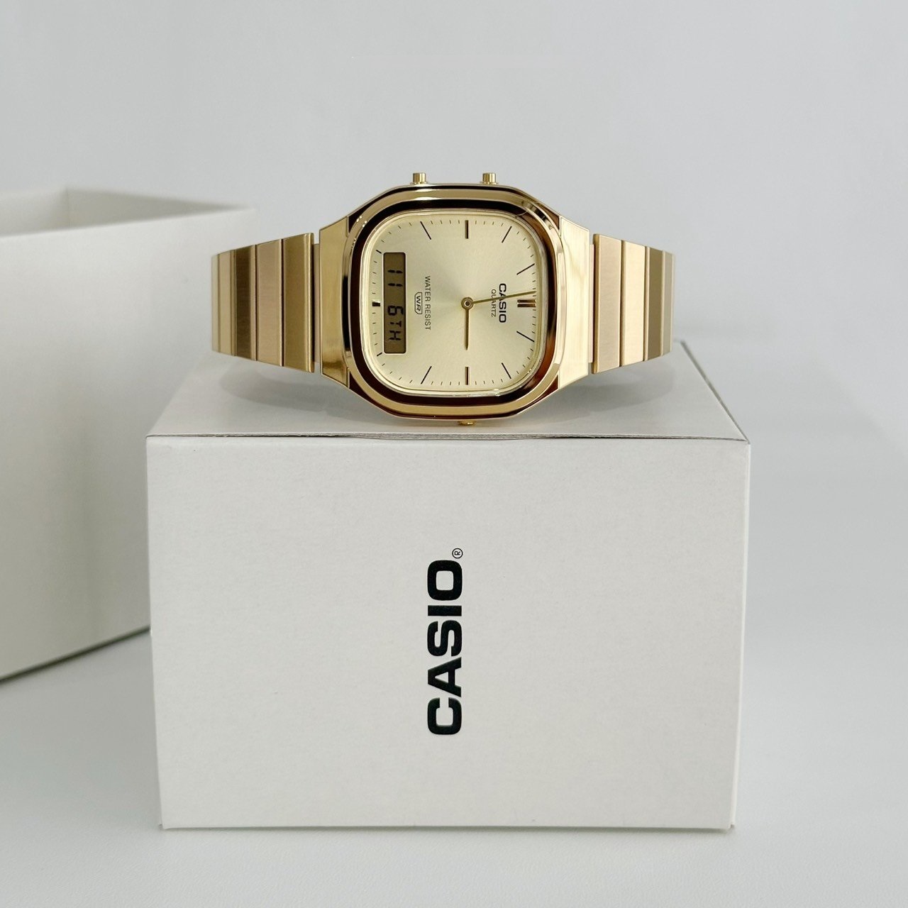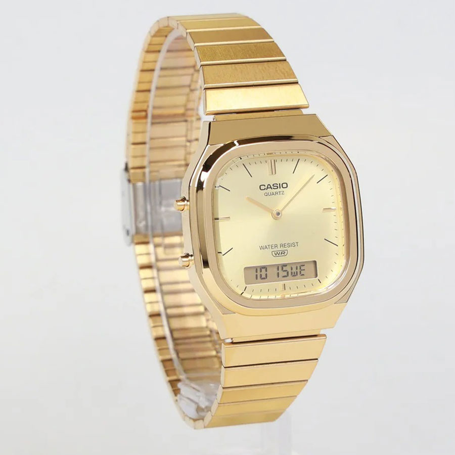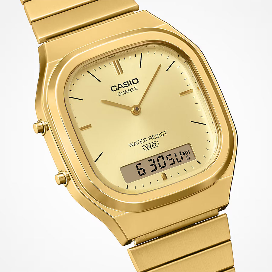CASIO AQ-240EG-9AEF — це уніcекс-годинник із серії Casio Vintage, у якому ретро-модерн зустрічається з неприхованою розкішшю золота. Серія AQ-240 з’явилась у 2025 році як переосмислення культової AQ-230 — і одразу завоювала серця тих, хто шукає щось між класичним годинником і сучасним аксесуаром.