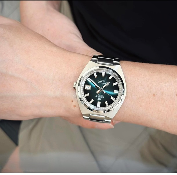 Головна родзинка цієї версії — циферблат кольору тіль із градієнтним sun-ray фінішингом, який змінює відтінок залежно від кута падіння світла: то холодний зеленувато-сірий, то глибокий бірюзовий. Срібні стрілки та індекси з люмінесцентним покриттям чітко виділяються на цьому тлі, а віконце дати доповнює образ функціональністю без зайвого.