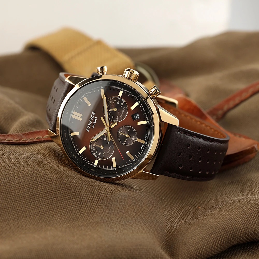 Круглий корпус із нержавіючої сталі розміром 47,9 × 40,5 × 12,6 мм із тонким вузьким безелем золотистого кольору — елегантний, але не надмірний. Коричневий шкіряний ремінець надає образу розслабленої вишуканості, поєднуючи спортивний характер Edifice з теплотою класичного шкіряного аксесуара. Три хронографні пушери праворуч — пряма цитата з гоночного спадку серії.