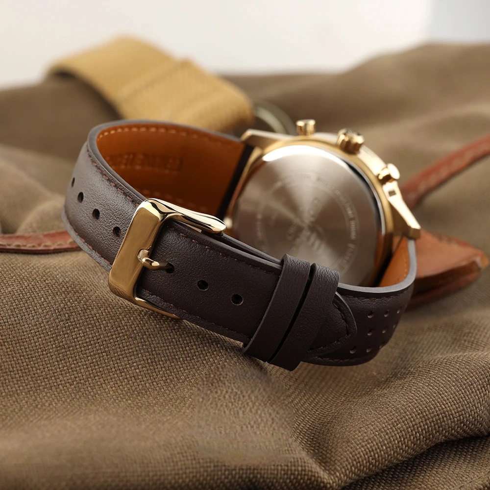 Головна родзинка цієї версії — теплий коричневий циферблат із градієнтним ефектом і контрастними субциферблатами, що нагадують компоновку приладової панелі ретро-спорткара. Стрілки та індекси з люмінесцентним покриттям чітко читаються за будь-якого освітлення, а опукле куполоподібне мінеральне скло надає циферблату живої, тривимірної глибини. Віконце дати — на своєму місці, без зайвого.