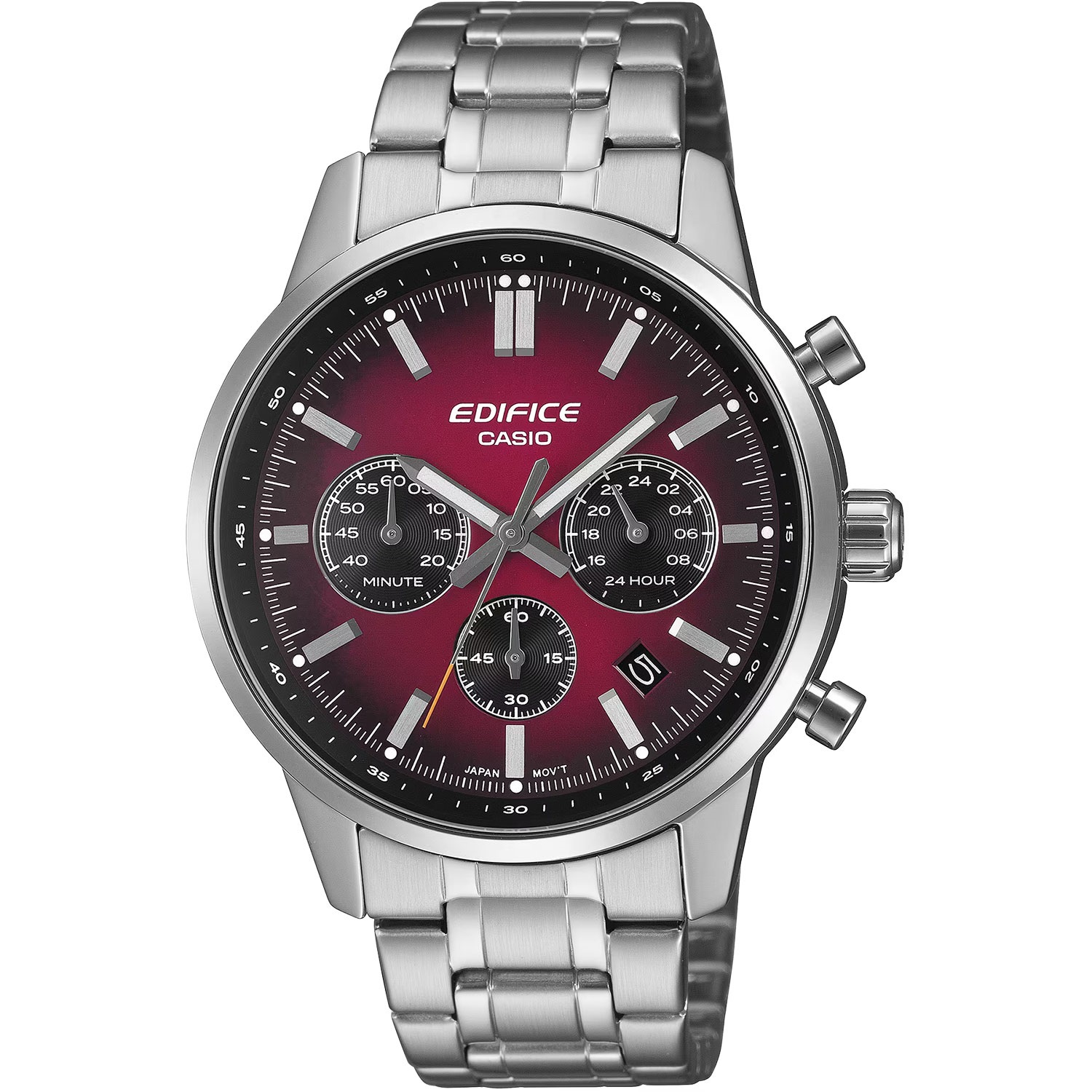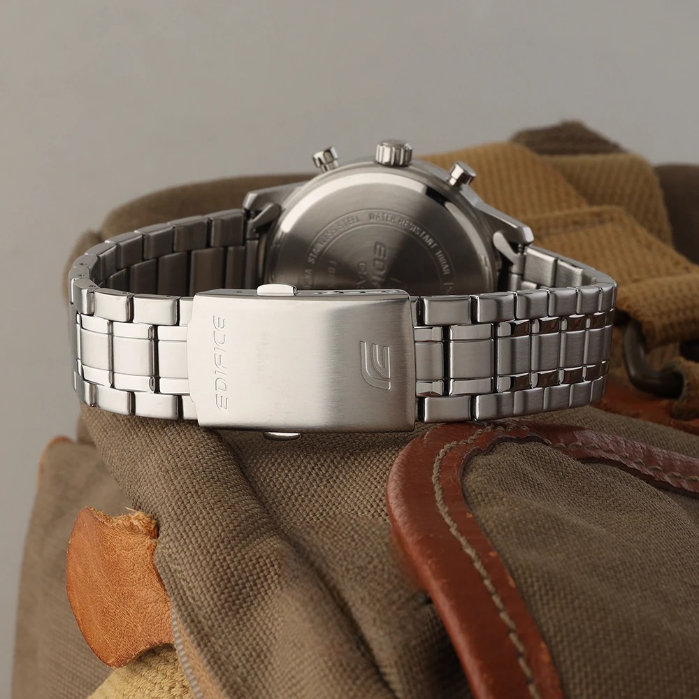 Круглий корпус із нержавіючої сталі розміром 47,9 × 40,5 × 12,6 мм із тонким вузьким безелем — виразний, але не масивний. Браслет із нержавіючої сталі зі складаним замком із кнопками утворює із корпусом монолітну, спортивно-ділову лінію. Три хронографні пушери праворуч — пряма цитата з гоночного спадку Edifice.