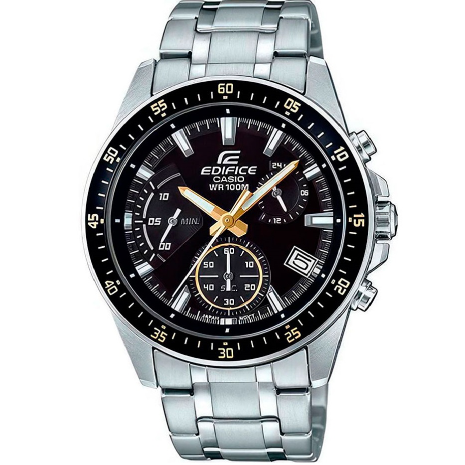 CASIO EFV-540D-1A9VUDF — це вибух стриманої сили та сучасної спортивної естетики, яка одразу відчувається в кожній деталі. Його глибоко-чорний циферблат із трьома хронографічними мініциферблатами оживає завдяки яскравим золотистим акцентам, що додають моделі енергії та характеру. Контрастні стрілки та індекси створюють виразну геометрію, а хронограф дозволяє відчути точність у дії — від секундних вимірів до контрольованого таймінгу.