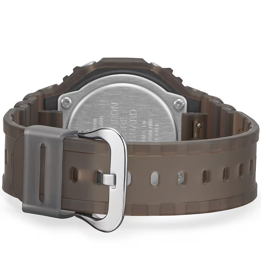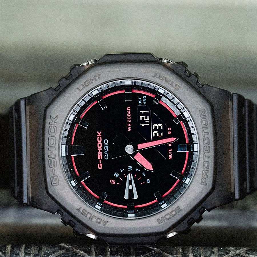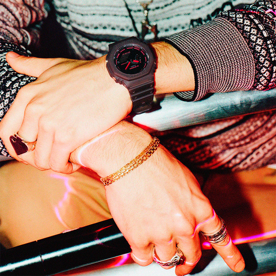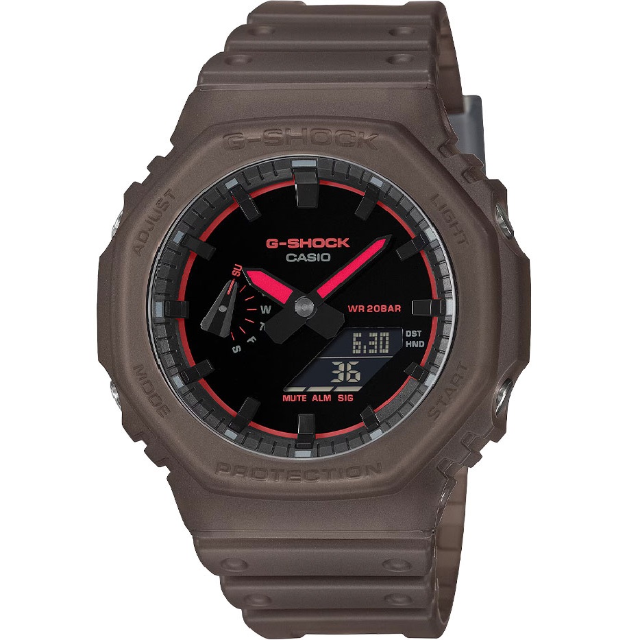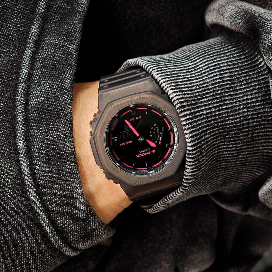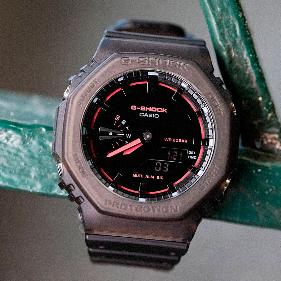 Напівпрозорий безель та ремінець із матової смоли теплого бурштиново-коричневого кольору — не звичайна чорна смола, а новий матеріал із хмарною, туманною текстурою, що нагадує атмосферу клубного залу в найгарячіший момент ночі. Усередині ця прозорість відкриває конструкцію Carbon Core Guard — і це вже не деталь, а шоу. Глянцевий чорний циферблат із новою рівною поверхнею поглинає світло, як темна сцена перед початком виступу, а яскраво-червоні неонові акценти на стрілках та індексах спалахують на цьому тлі, немов лазерний промінь крізь клубний дим. Тепле коричневе обрамлення та гарячий червоний — поєднання, що нагадує нічну вечірку в розпалі літа. Подвійне LED-підсвічування Super Illuminator освітлить і аналогову, і цифрову частину — одним натиском, у будь-яку ніч.