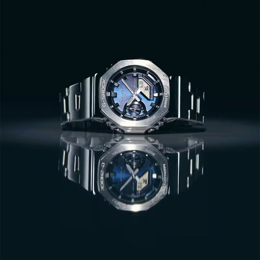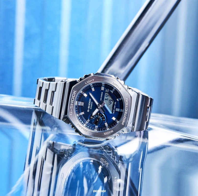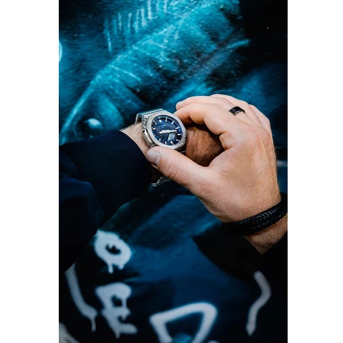 восьмикутний сталевий безель + повністю металевий браслет + темно-синій металевий циферблат, який змінюється під світлом — від глибокого navy до майже чорного. Це той колір, який не набридає і виглядає дорого без зусиль. Циферблат аналогово-цифровий, багаторівневий, але при цьому зберігає чітку читабельність навіть при складній геометрії.
