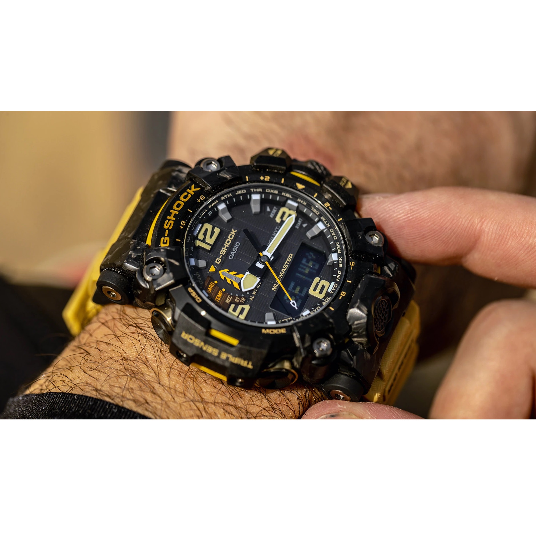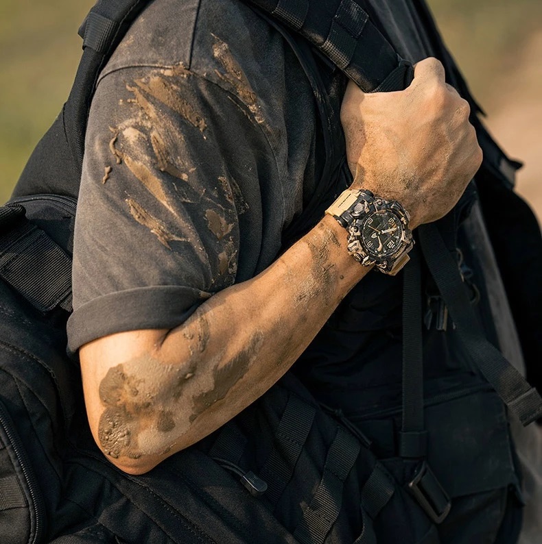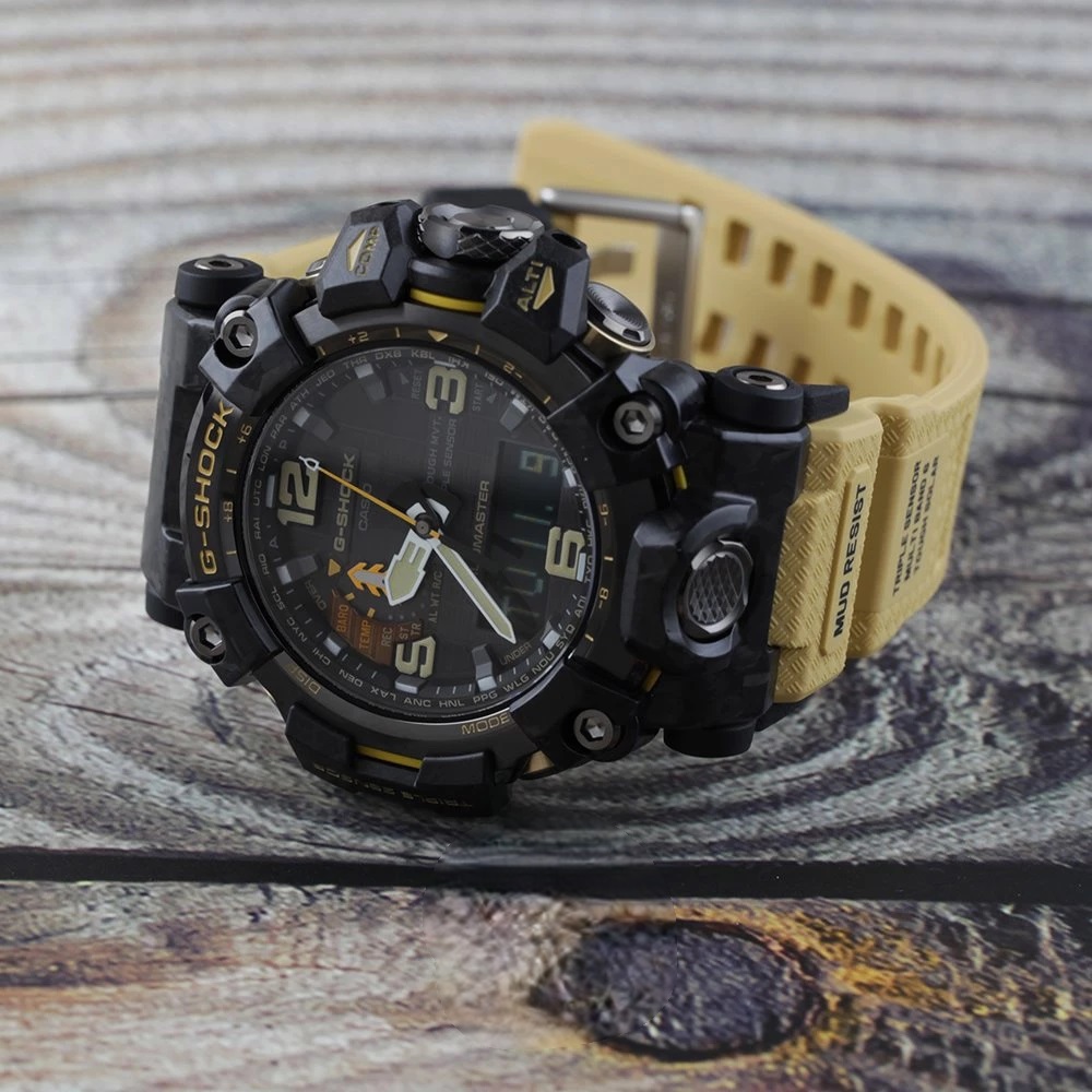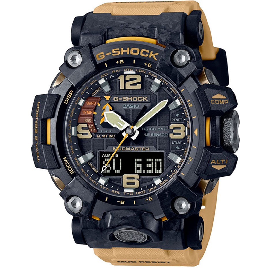 Цей Mudmaster оснащено Tough Solar для надійної автономності, Multi‑Band 6 для автоматичної синхронізації часу у 6 радіозонах, а потрійний сенсор (компас, альтиметр/барометр, термометр) дає повний контроль над навколишнім середовищем. Додаткові функції: 5 будильників, секундомір, таймер зворотного відліку, світовий час, автоматичний календар до 2099 року, а також стійкість до низьких температур до −10 °C і водозахист WR200.