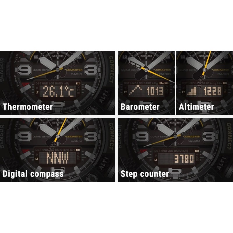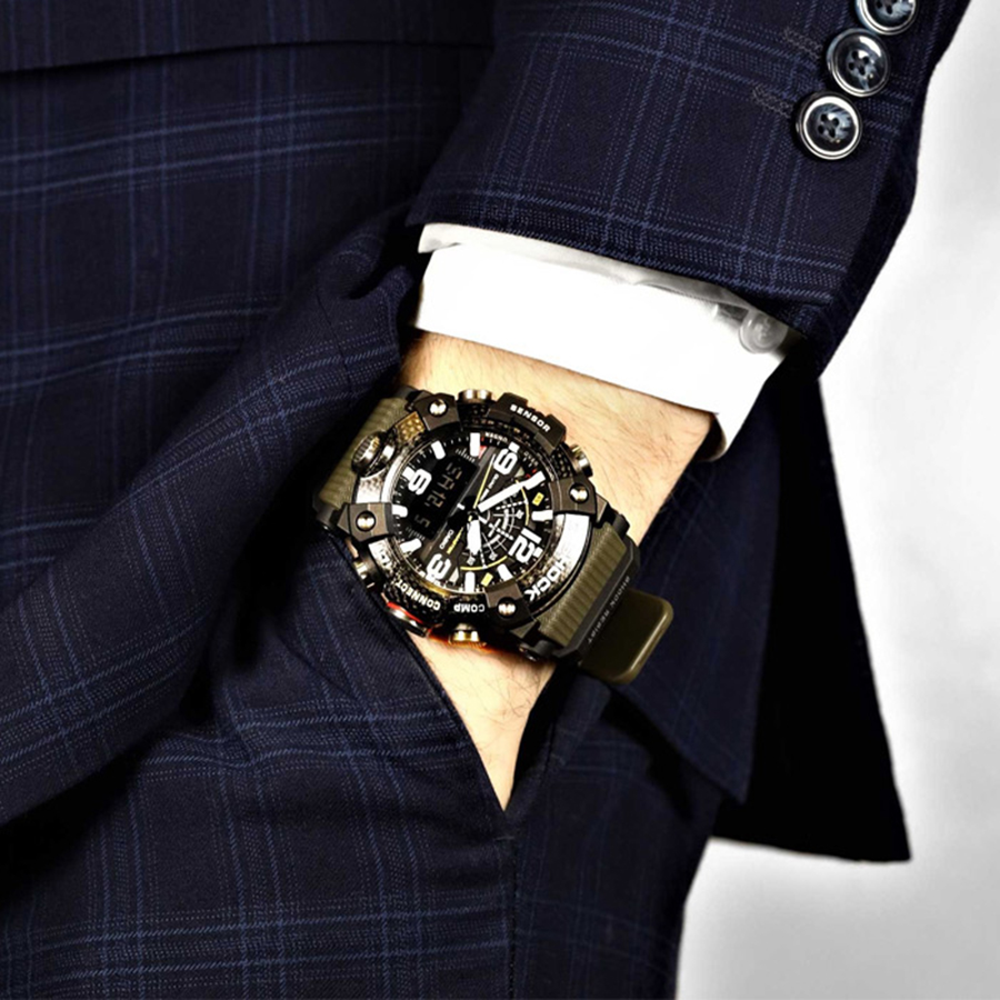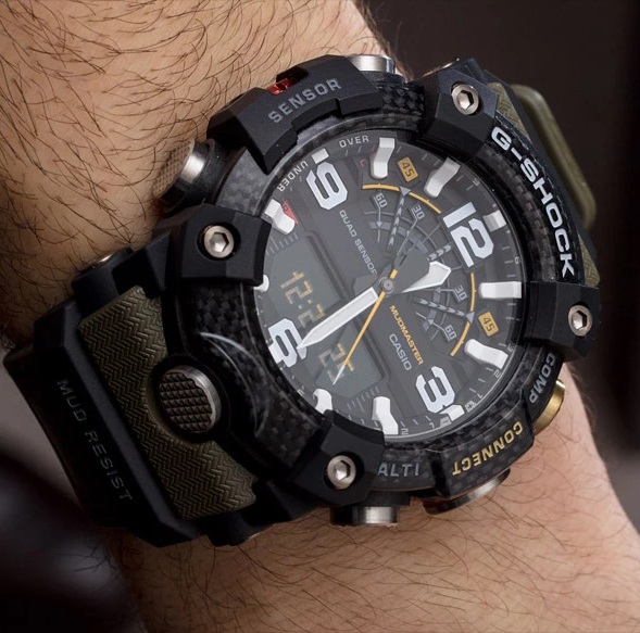 Конструкція створена для жорстких умов: Mud Resist захист не пропускає пил і бруд, а карбоновий корпус забезпечує високу герметичність і стійкість до деформацій. Функціонально — повний набір: світовий час, таймер, секундомір, 5 будильників, автоматичний календар, відображення сходу і заходу сонця, що вже натякає — цей годинник про реальні виходи в природу.