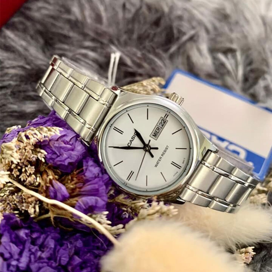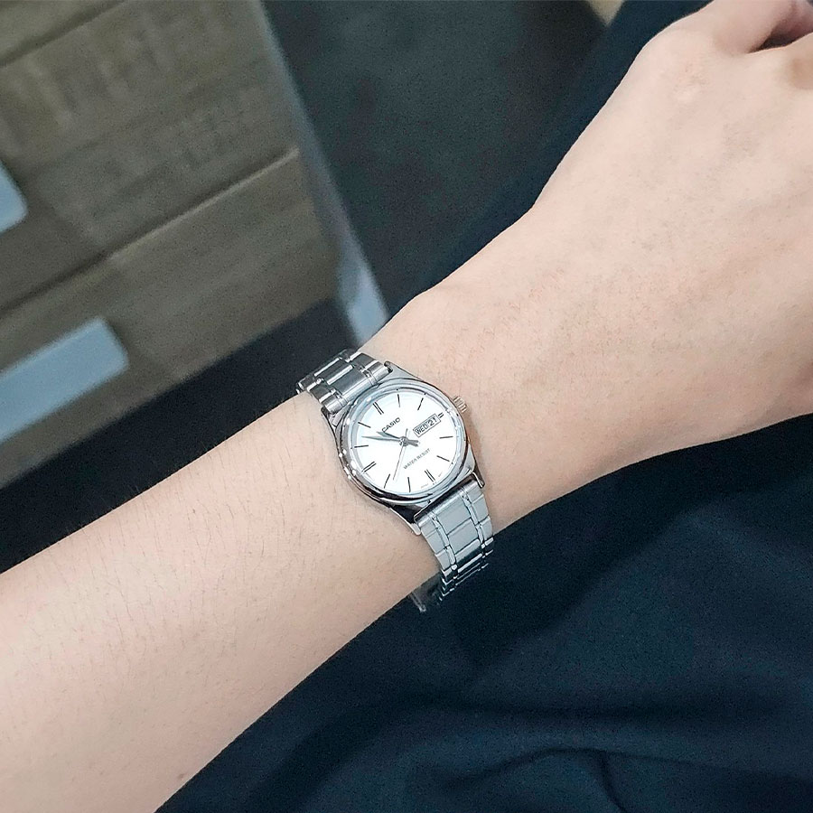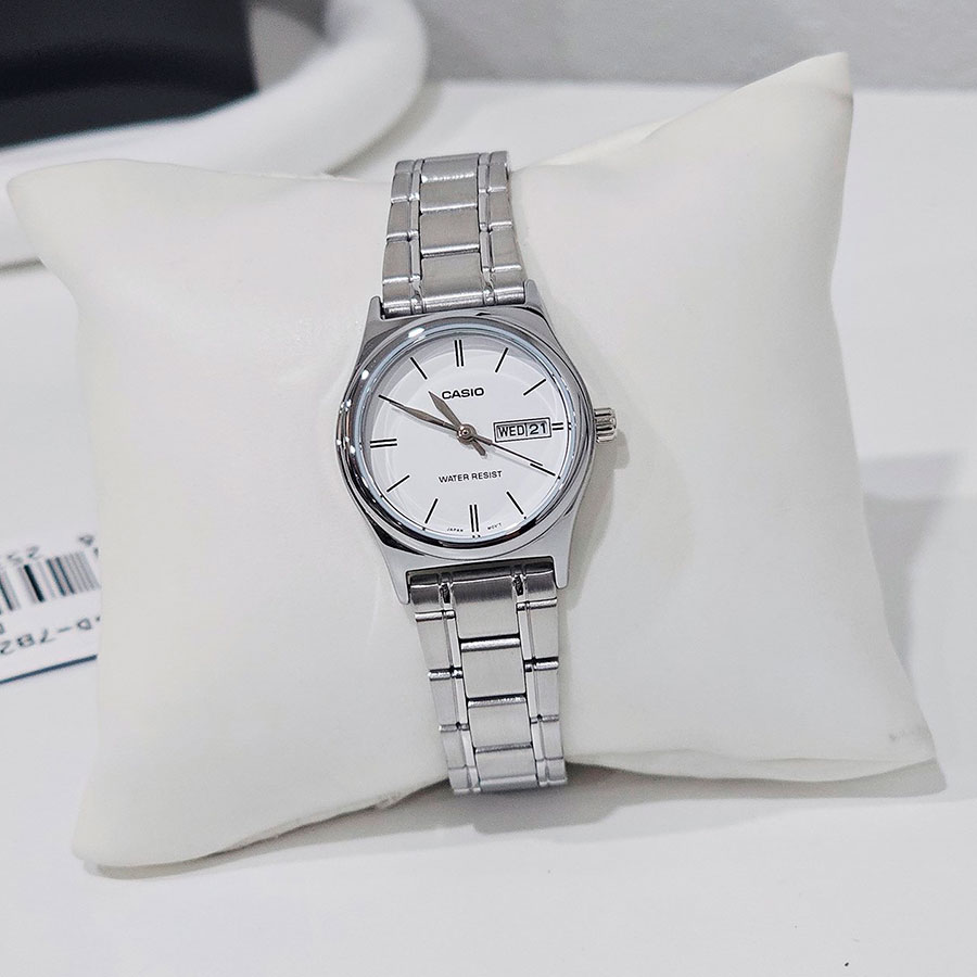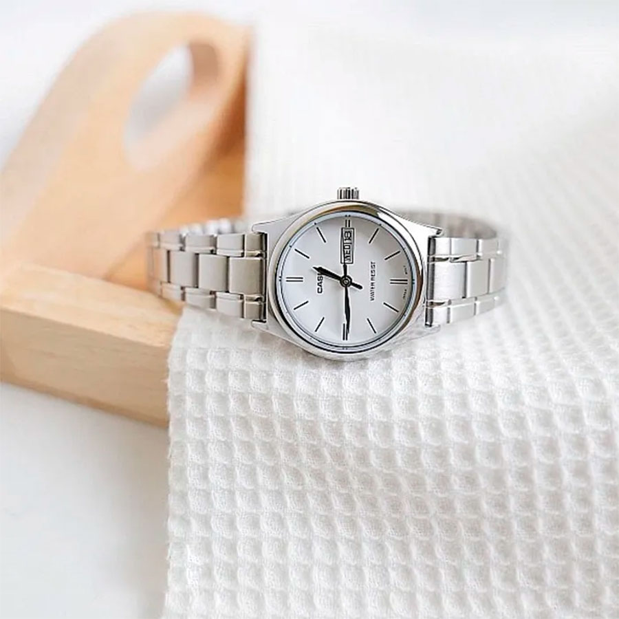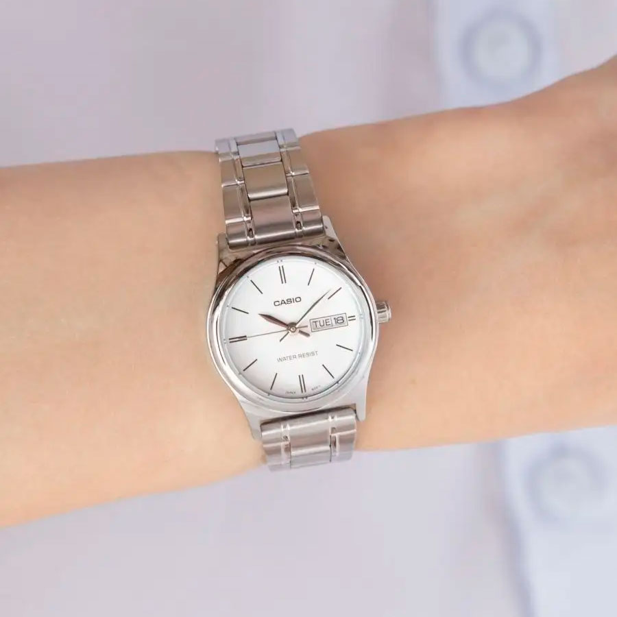 CASIO LTP-V006D-7B2 — це жіночий годинник, у якому класика промовляє через тишу деталей. Його круглий корпус із нержавіючої сталі має витончені обриси та дзеркальне поліроване покриття, що ніжно грає на світлі. Але вся увага — до чистого білого циферблата, на якому замість цифр розміщені лаконічні тонкі мітки, що створюють відчуття повітря, спокою і бездоганного порядку. Акуратні стрілки, два витончено інтегровані віконця — дати й дня тижня, та ідеальна симетрія роблять цей годинник справжнім уособленням жіночої стриманості та впевненості. Завершує образ сталевий браслет, який гармонійно поєднується з корпусом і додає відчуття завершеності.