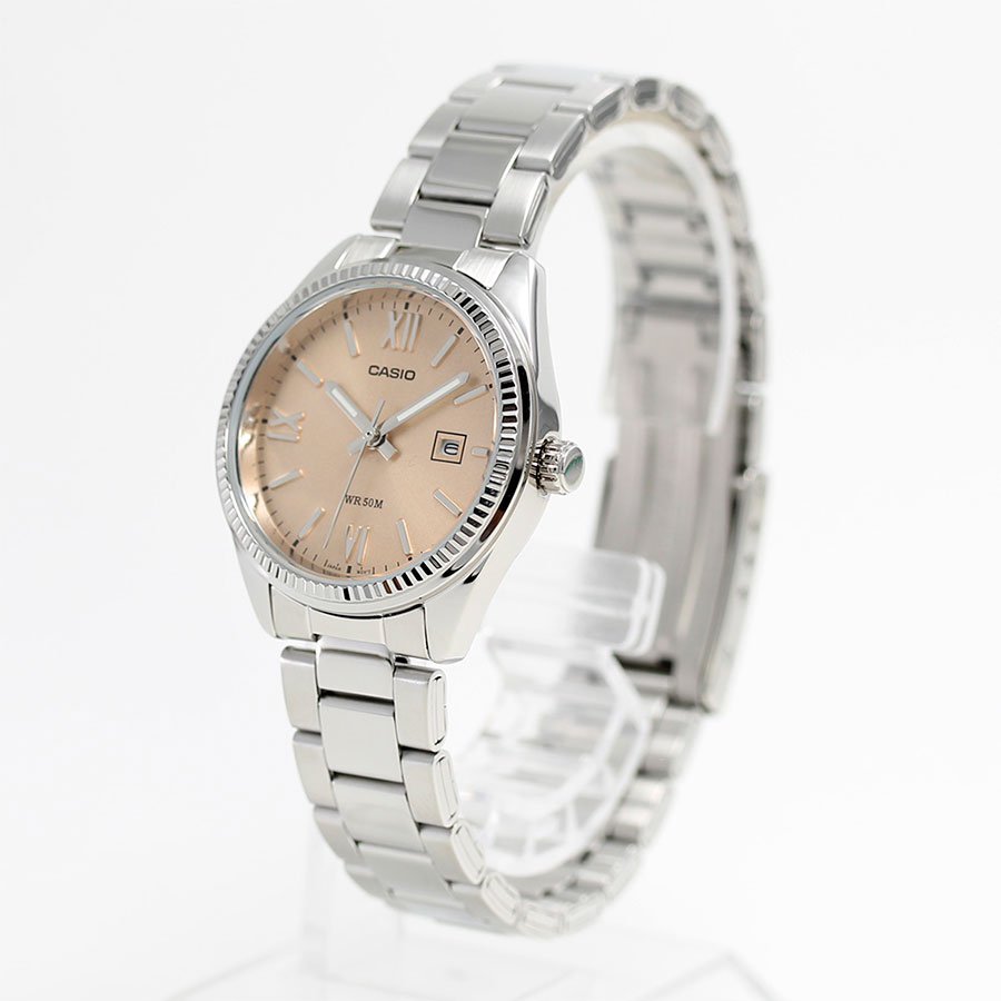 CASIO LTP-1302DD-4A2VEF — це жіночий годинник, який випромінює вишуканість, ніжність і класичну гармонію. Його сріблястий корпус і браслет із нержавіючої сталі створюють відчуття благородного блиску та сучасної елегантності, а циферблат теплого бежево-рожевого відтінку шампань додає образу м’якості та жіночності.
