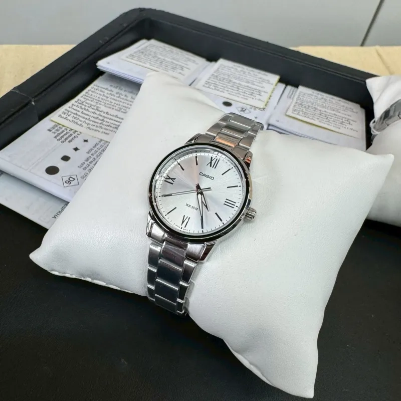 CASIO LTP-1303DD-7AVDF — це втілення стриманої жіночої класики, де чистота дизайну поєднується з бездоганною елегантністю. Білий циферблат виглядає світло й акуратно, створюючи відчуття свіжості та візуальної легкості. Він слугує ідеальним фоном для сріблястих рисок, міток, римських цифр і стрілок, які забезпечують чітку читабельність і підкреслюють класичний характер моделі. Відсутність віконця дати робить дизайн максимально чистим і збалансованим.
