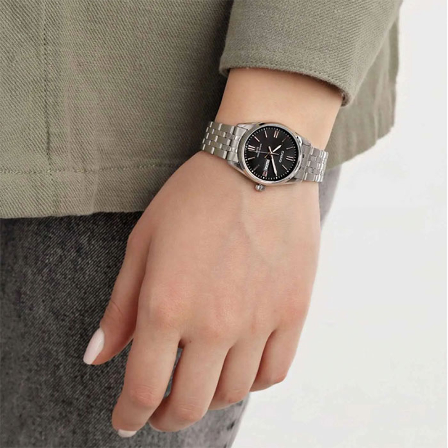 В центрі — глибокий чорний циферблат, по колу підкреслений тонким кільцем теплого металевого відтінку. На цьому насиченому тлі виразно виділяються об’ємні мітки та стрілки кольору рожевого золота, створюючи елегантний контраст і додаючи годиннику нотку стриманої розкоші. Віконце дня тижня та дати на позначці 3 години робить модель не лише красивою, а й дуже зручною в повсякденному ритмі.