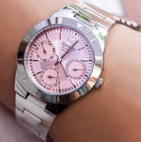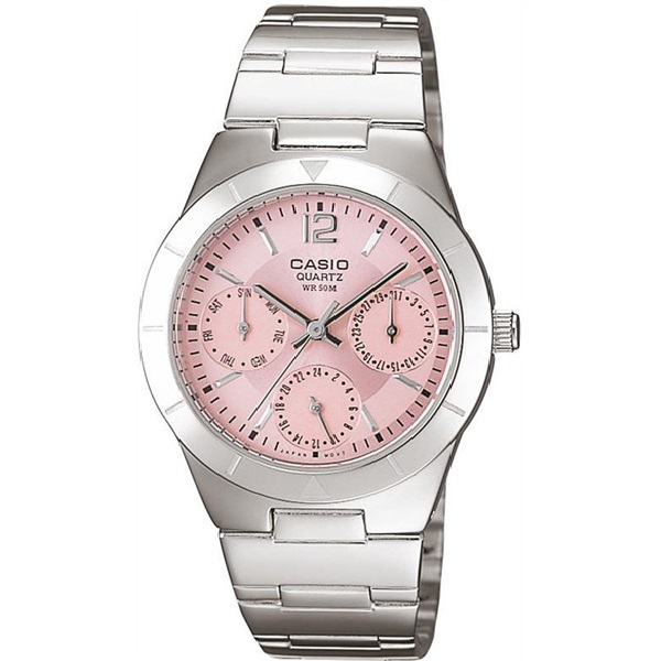 CASIO LTP-2069D-4AVEF — це елегантний жіночий годинник із ніжним рожевим циферблатом, трьома додатковими циферблатами та сталевим браслетом, створений для тих, хто цінує витонченість, комфорт і стильні деталі в кожному елементі.