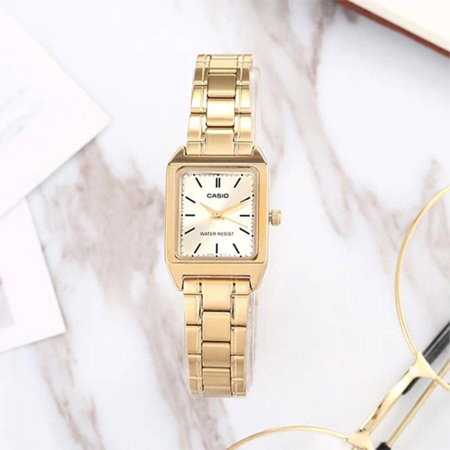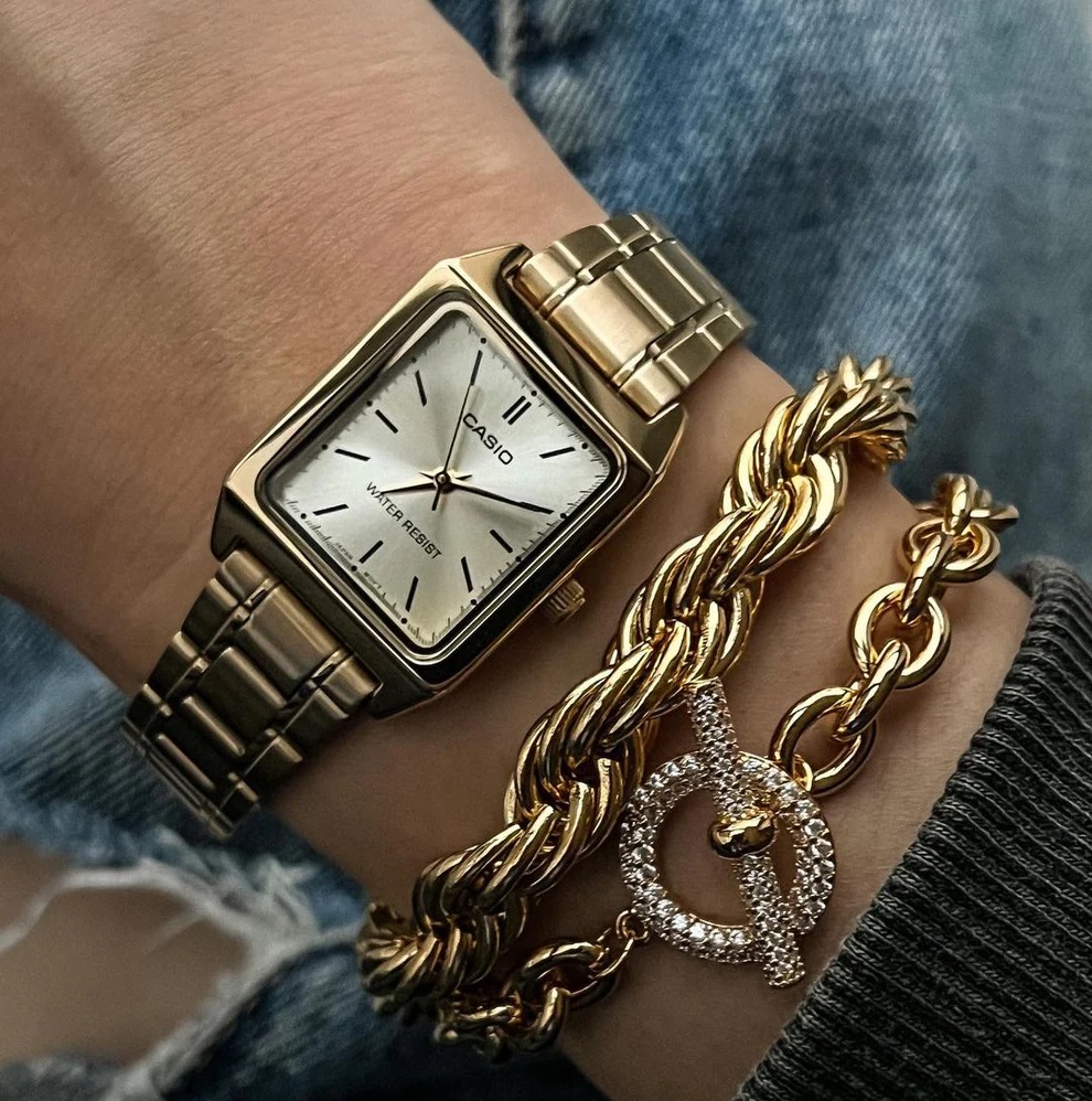 CASIO LTP-V007G-9EUDF — це елегантний жіночий годинник, який поєднує вишукану класику та розкішне золоте сяйво. Його прямокутний корпус із нержавіючої сталі з PVD-покриттям золотистого кольору виглядає витончено та стильно, а браслет у тому ж відтінку гармонійно доповнює загальний образ, створюючи відчуття цілісності та благородності.