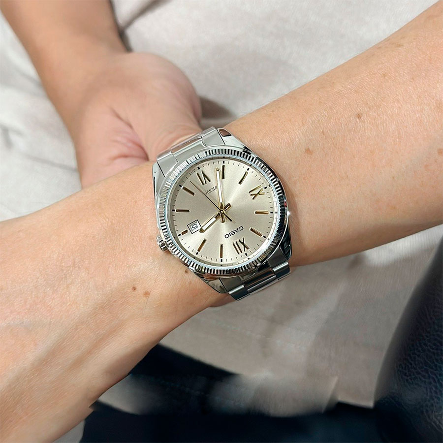 У чоловічій моделі CASIO MTP-1302DD-9AVEF розміщено золотисті римські цифри, мітки та стрілки зі світлонакопичувачем, що надають образу глибини та впевненості. У жіночій CASIO LTP-1302DD-4A2VEF — ті ж лінії, але в сріблястому виконанні, що робить її ніжнішою та витонченішою версією класики.