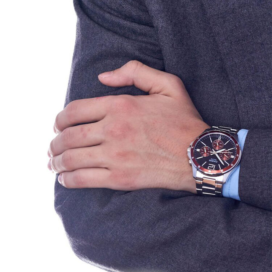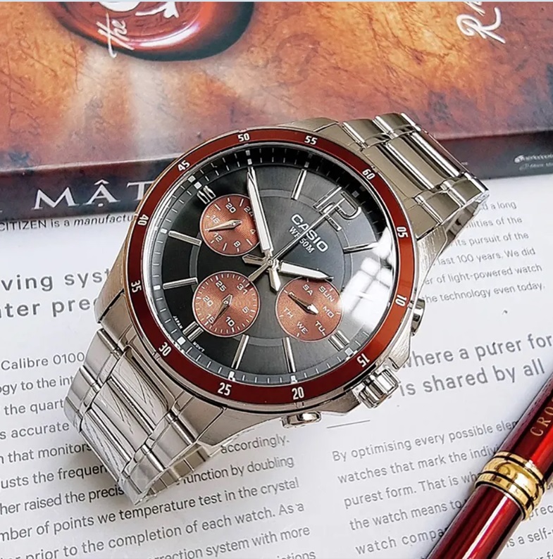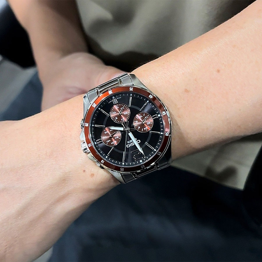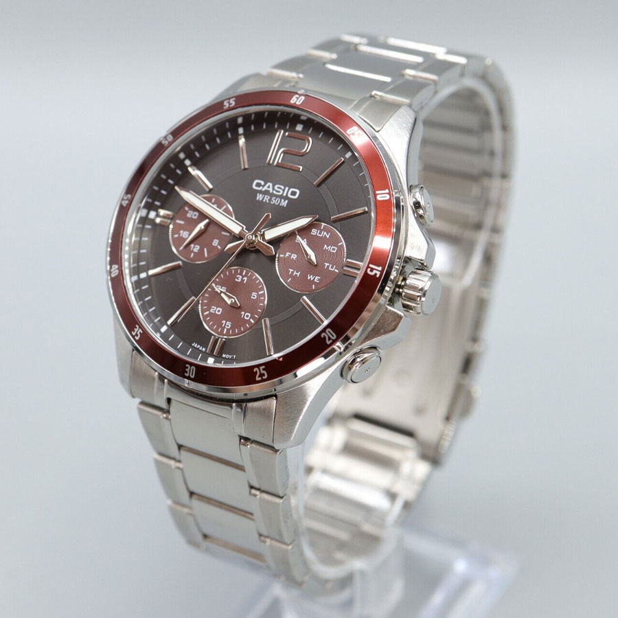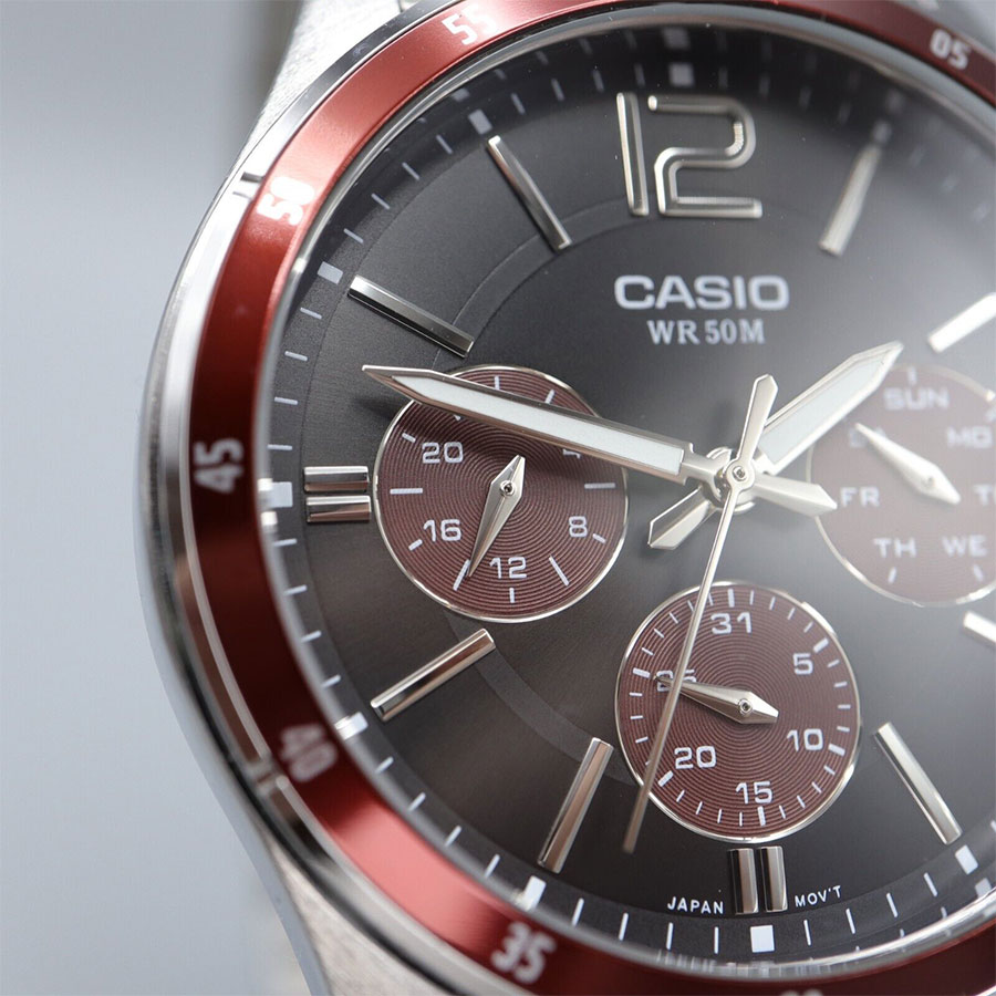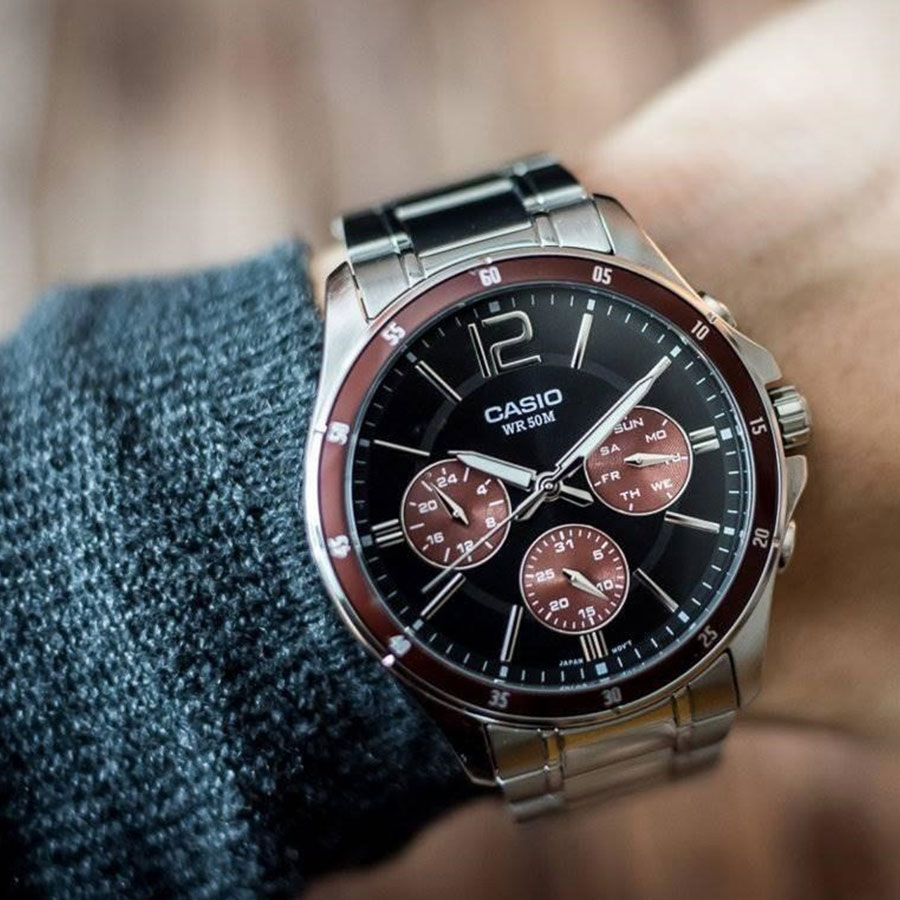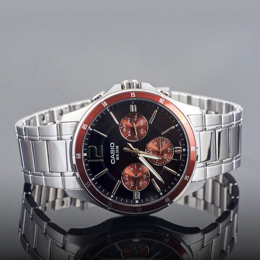 CASIO MTP-1374D-5AVDF — елегантний чоловічий годинник, у якому класичний дизайн гармонійно поєднується з практичною функціональністю. Сталевий корпус і браслет підкреслюють стриманий і універсальний характер моделі, а чорний циферблат із теплими коричневими акцентами надає годиннику глибини та виразності. Такий контраст виглядає стильно й благородно, додаючи образу особливого характеру.