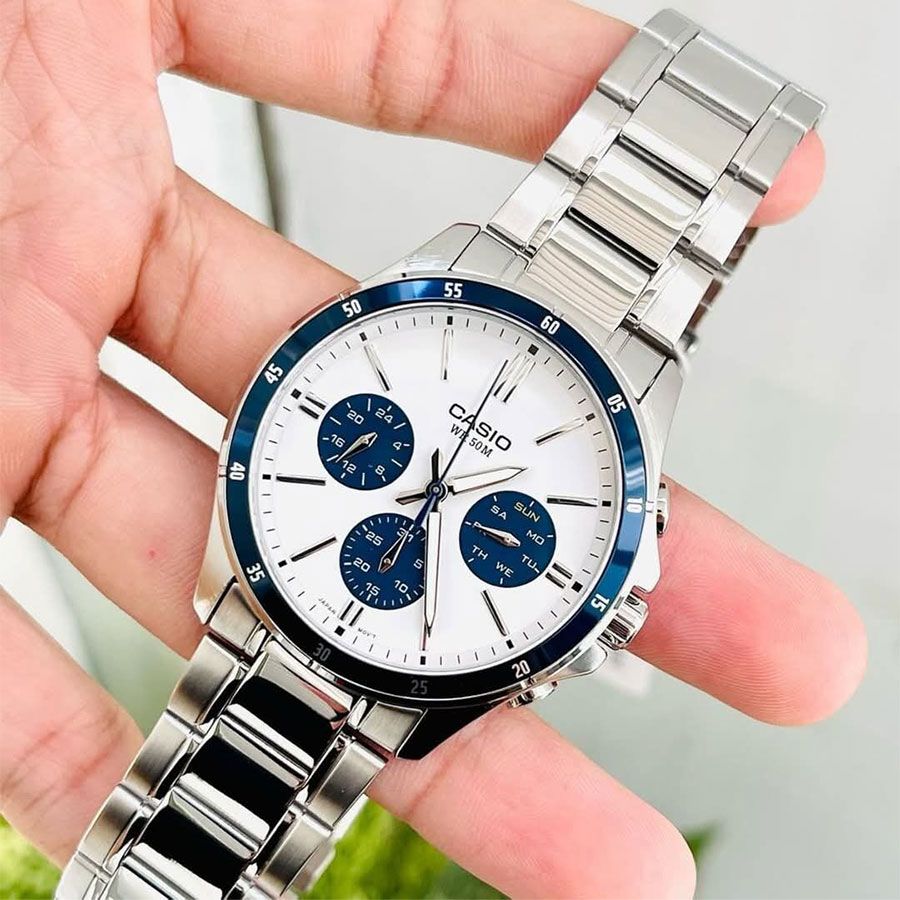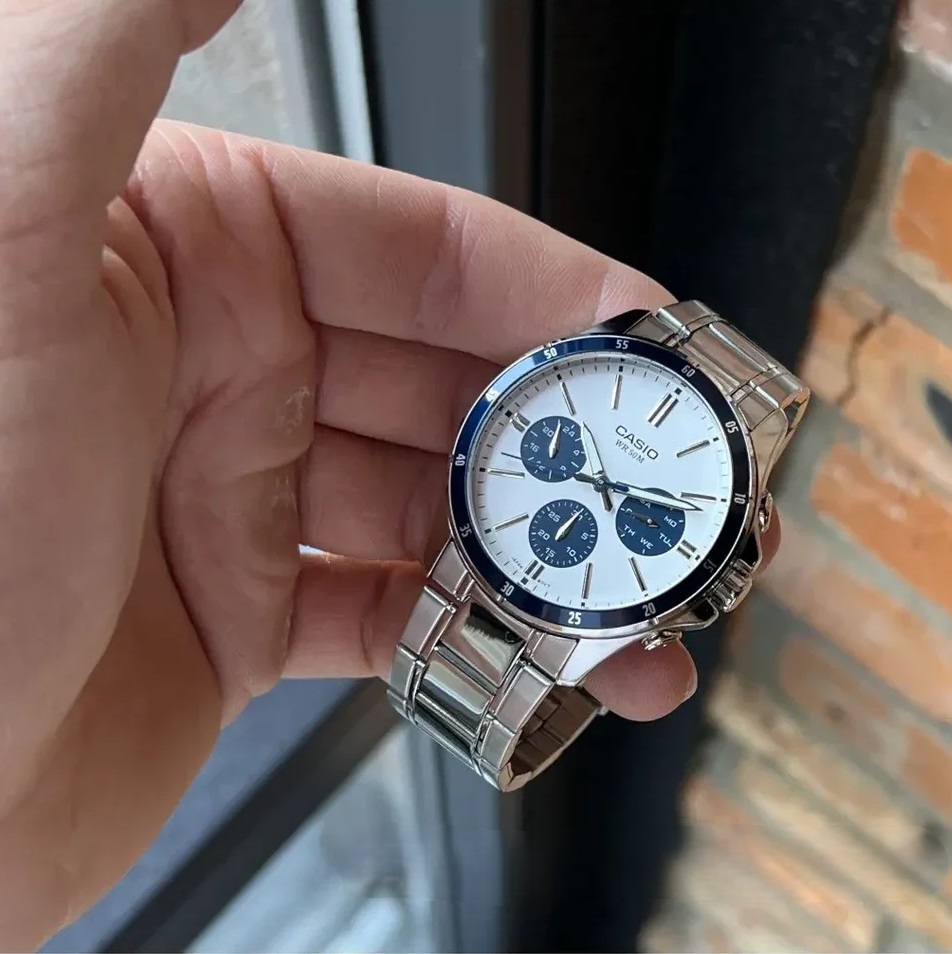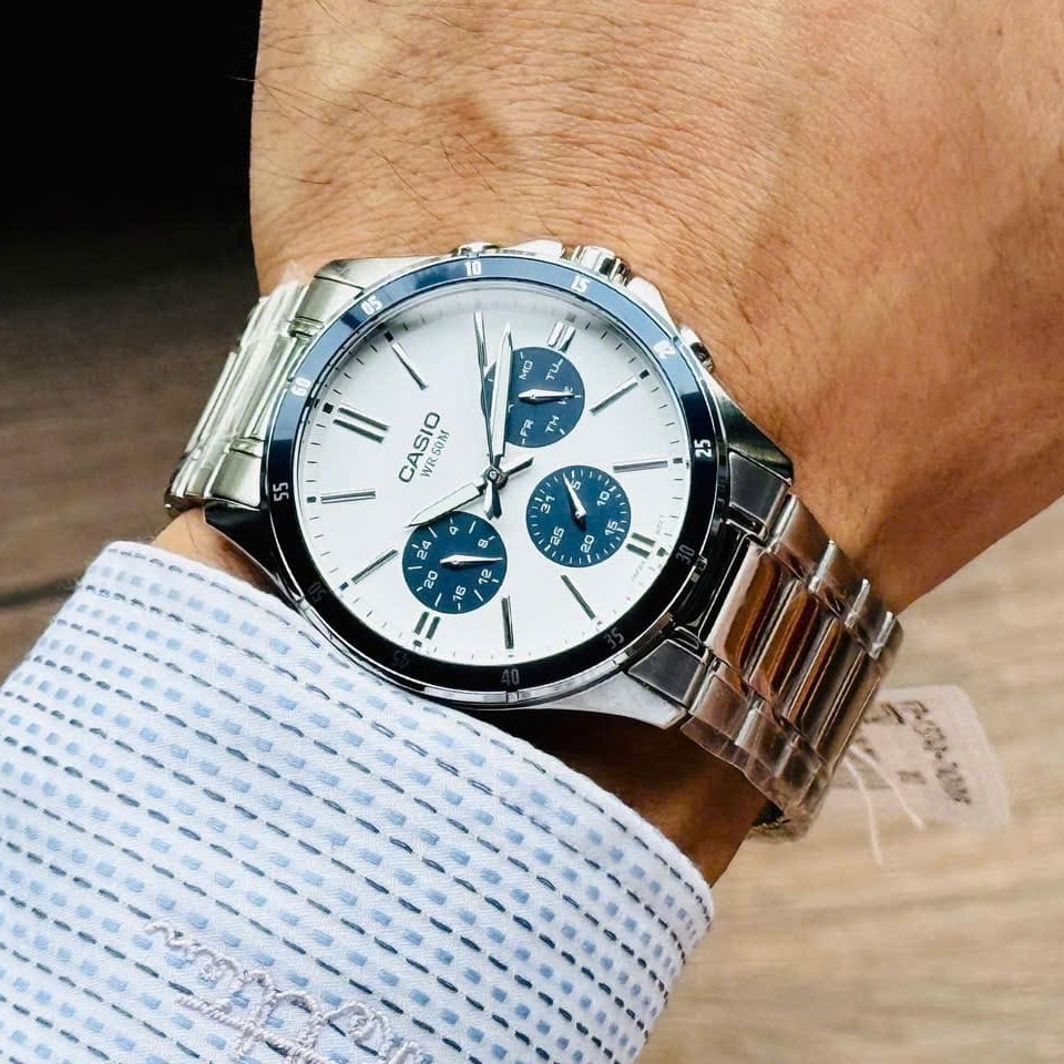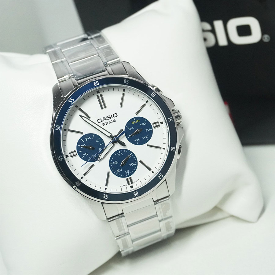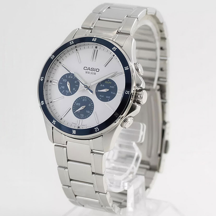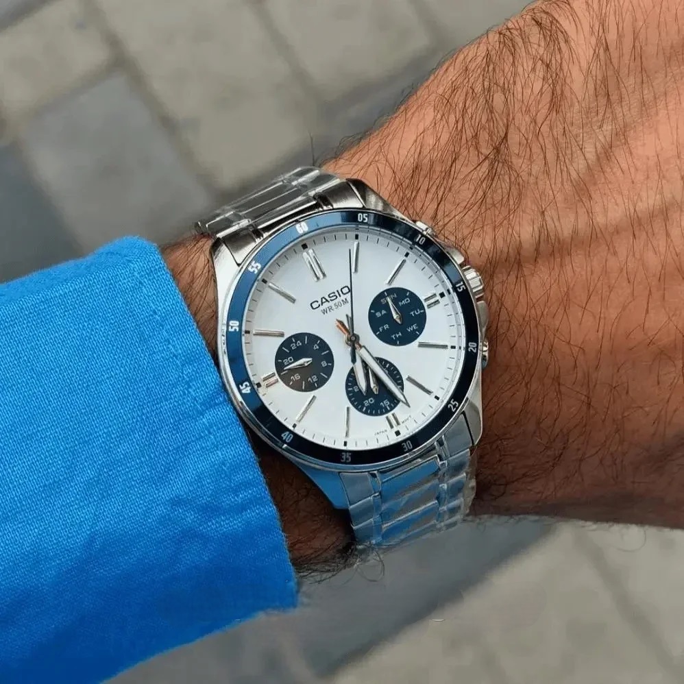 CASIO MTP-1374D-7A2VDF — елегантний чоловічий годинник, у якому класичний дизайн поєднується з практичною функціональністю. Сталевий корпус і браслет підкреслюють стриманий і універсальний стиль моделі, а світлий сріблясто-білий циферблат із синіми акцентами виглядає свіжо та виразно, забезпечуючи чудову читабельність.