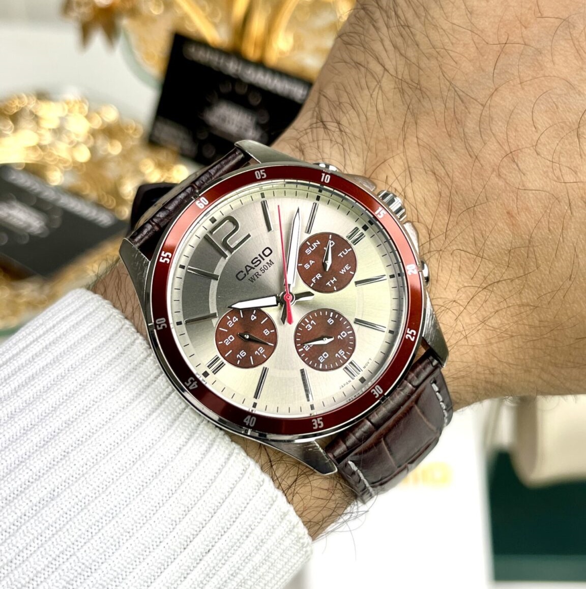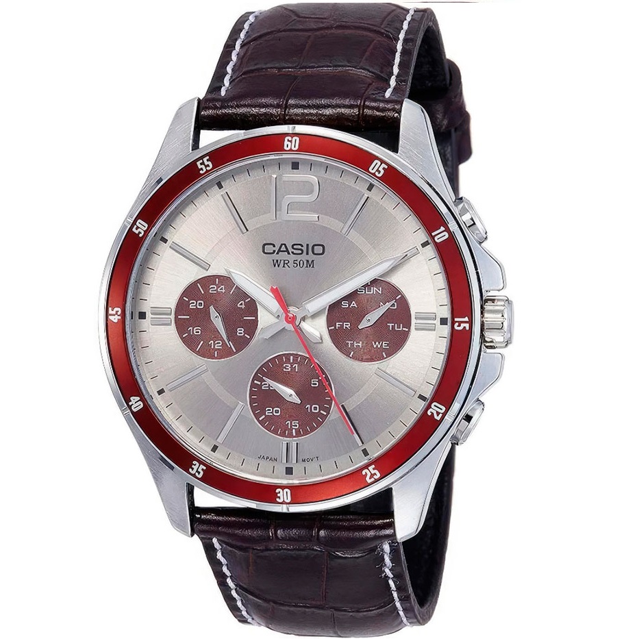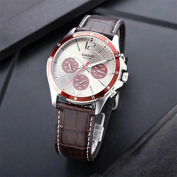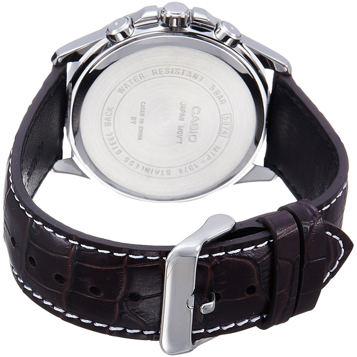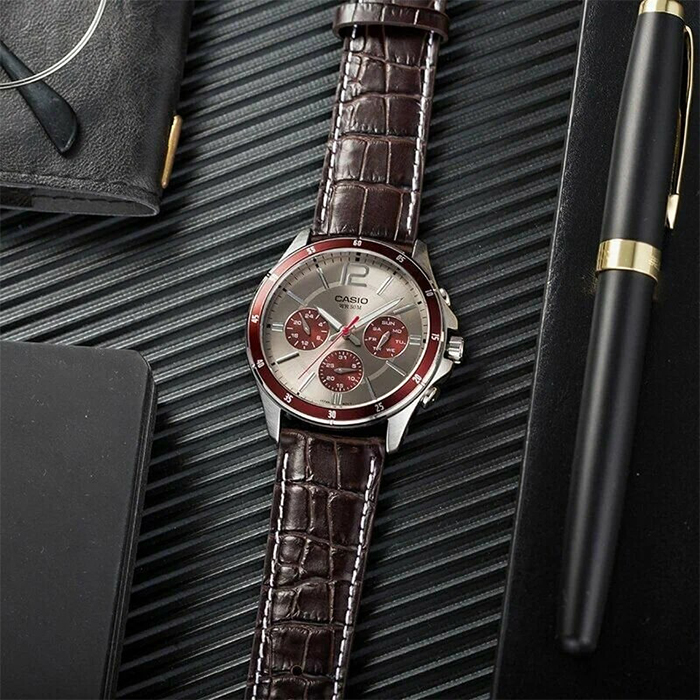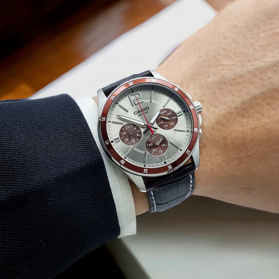 CASIO MTP-1374L-7A1VDF — елегантний чоловічий годинник у класичному стилі, який поєднує стриманий дизайн і практичність щоденного використання. Сріблястий корпус гармонійно доповнюється коричневим шкіряним ремінцем, створюючи теплий і благородний образ, що однаково добре пасує як до ділового костюма, так і до повсякденного стилю. Світлий сріблясто-сірий циферблат із контрастними індикаторами виглядає чисто й елегантно, забезпечуючи легке зчитування часу.