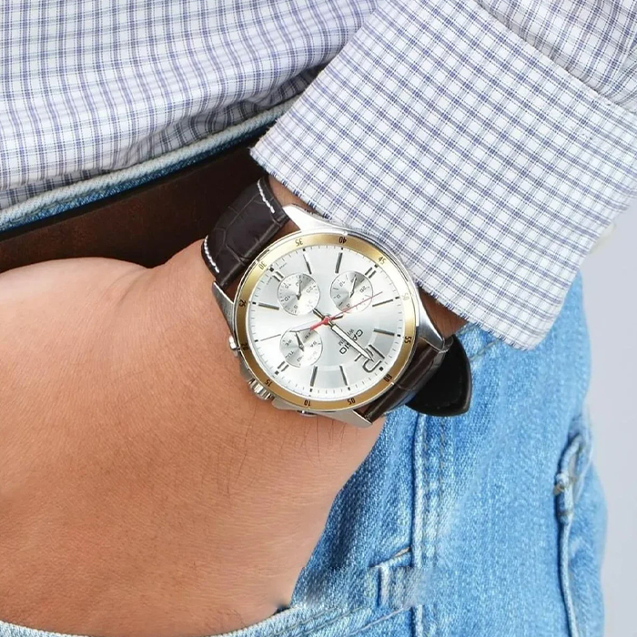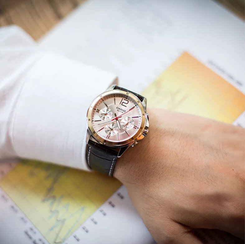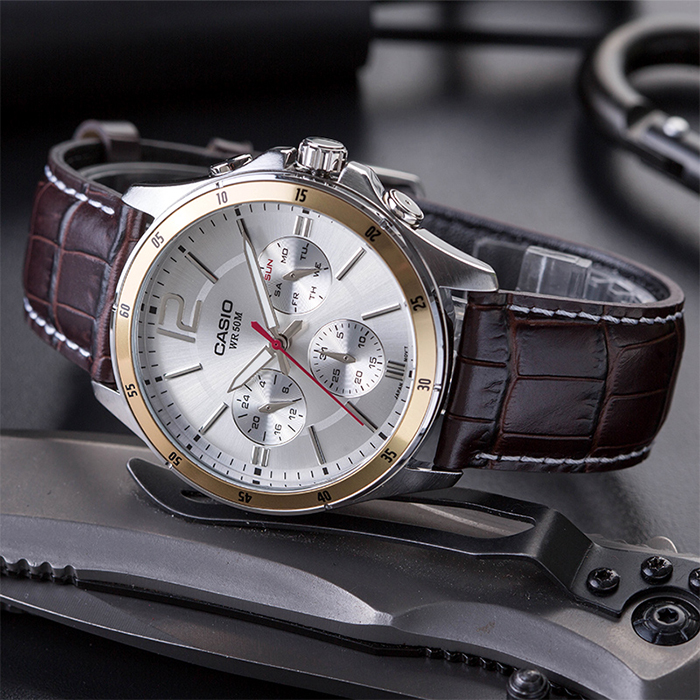 CASIO MTP-1374L-7AVDF — класичний чоловічий годинник, у якому елегантність поєднується з практичною функціональністю на кожен день. Золотистий корпус гармонійно поєднується з коричневим шкіряним ремінцем, створюючи теплий і благородний образ, який однаково добре підходить і до ділового стилю, і до повсякденного гардероба. Світлий сріблясто-білий циферблат із золотистими акцентами виглядає чисто та елегантно, забезпечуючи відмінну читабельність часу.