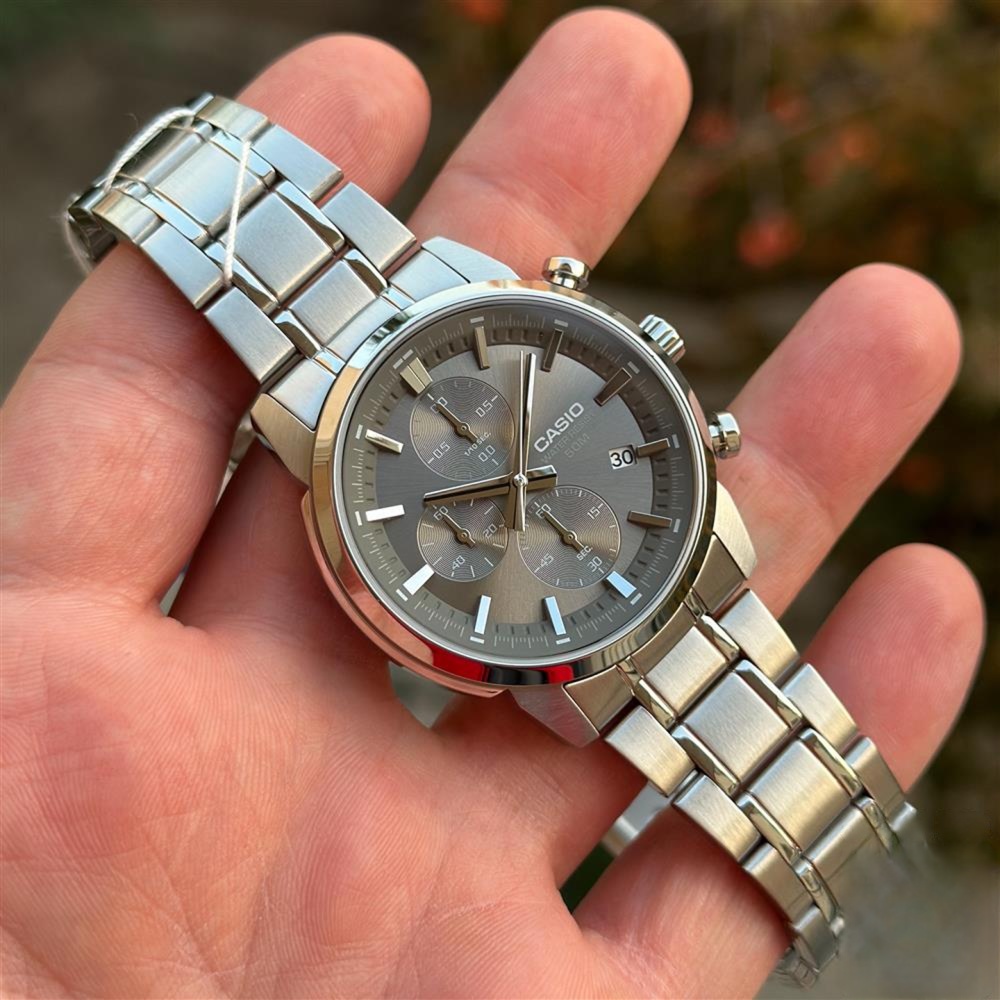 CASIO MTP-E510D-8AVDF створений для тих, хто цінує стриману мужність у кожній деталі. Його холодний сірий циферблат виглядає глибоко й елегантно, а контрастні стрілки та мітки формують чіткий, зібраний ритм. Акуратне вікно дати додає моделі практичності, хронограф з точністю 1/10 секунди працює впевнено і точно, дозволяючи контролювати час до 59 хвилин 59 секунд. Завинчувана задня кришка підсилює відчуття надійності, а сталевий браслет забезпечує комфортну посадку. Завдяки водозахисту WR50 годинник не боїться дощу чи бризок, а розміри корпусу 42 × 47.5 × 10.5 мм створюють збалансований силует, що виглядає гармонійно на будь-якому зап’ясті.