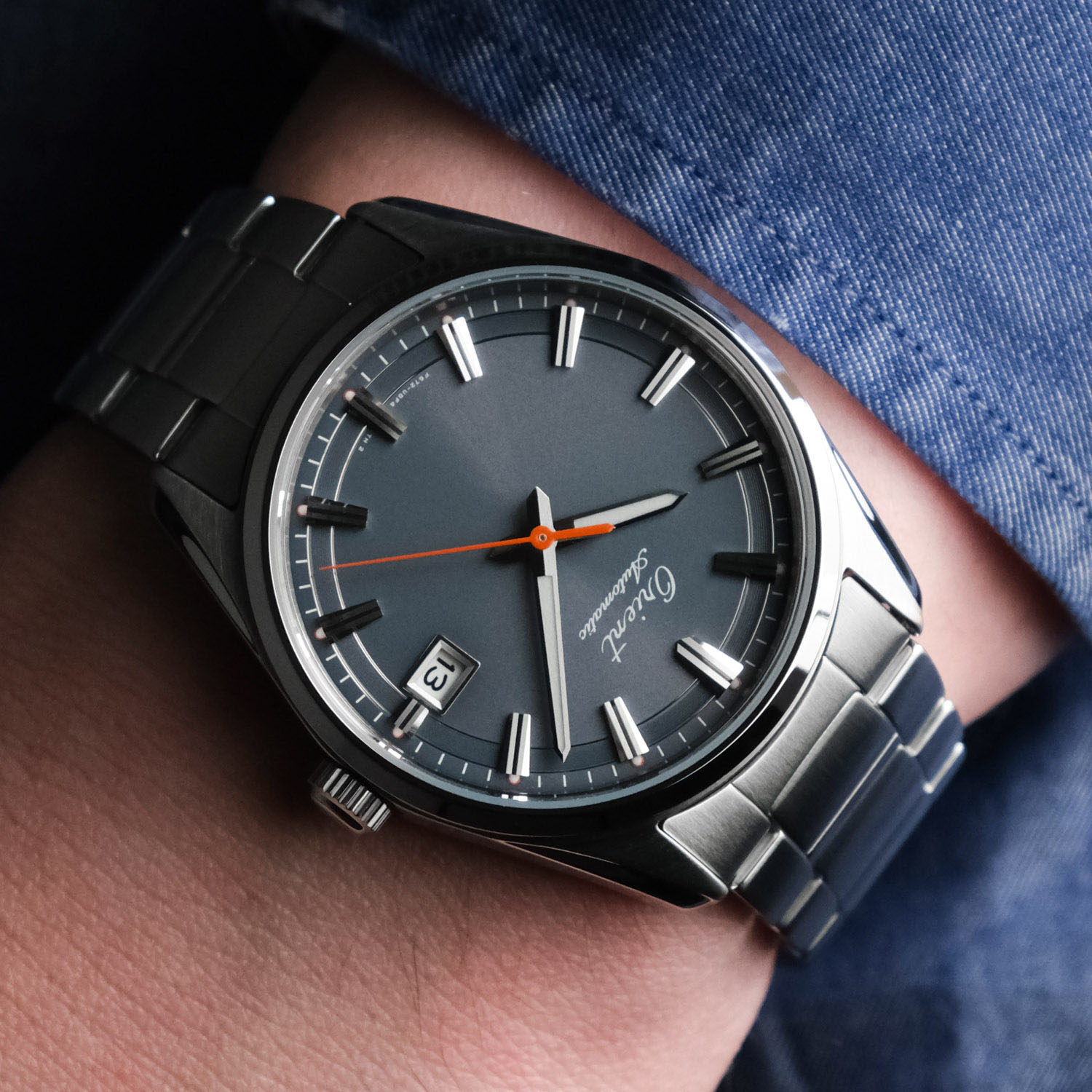 сталевий корпус + повністю металевий браслет + глибокий сірий sunburst-циферблат. Відтінок змінюється під світлом — від холодного сріблястого до насиченого графіту. Виглядає стримано… поки не з’являється акцент.