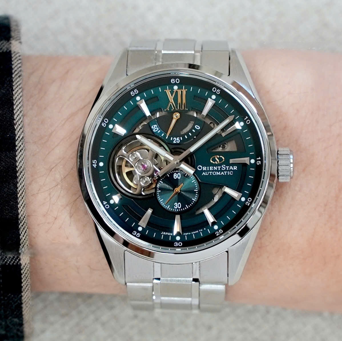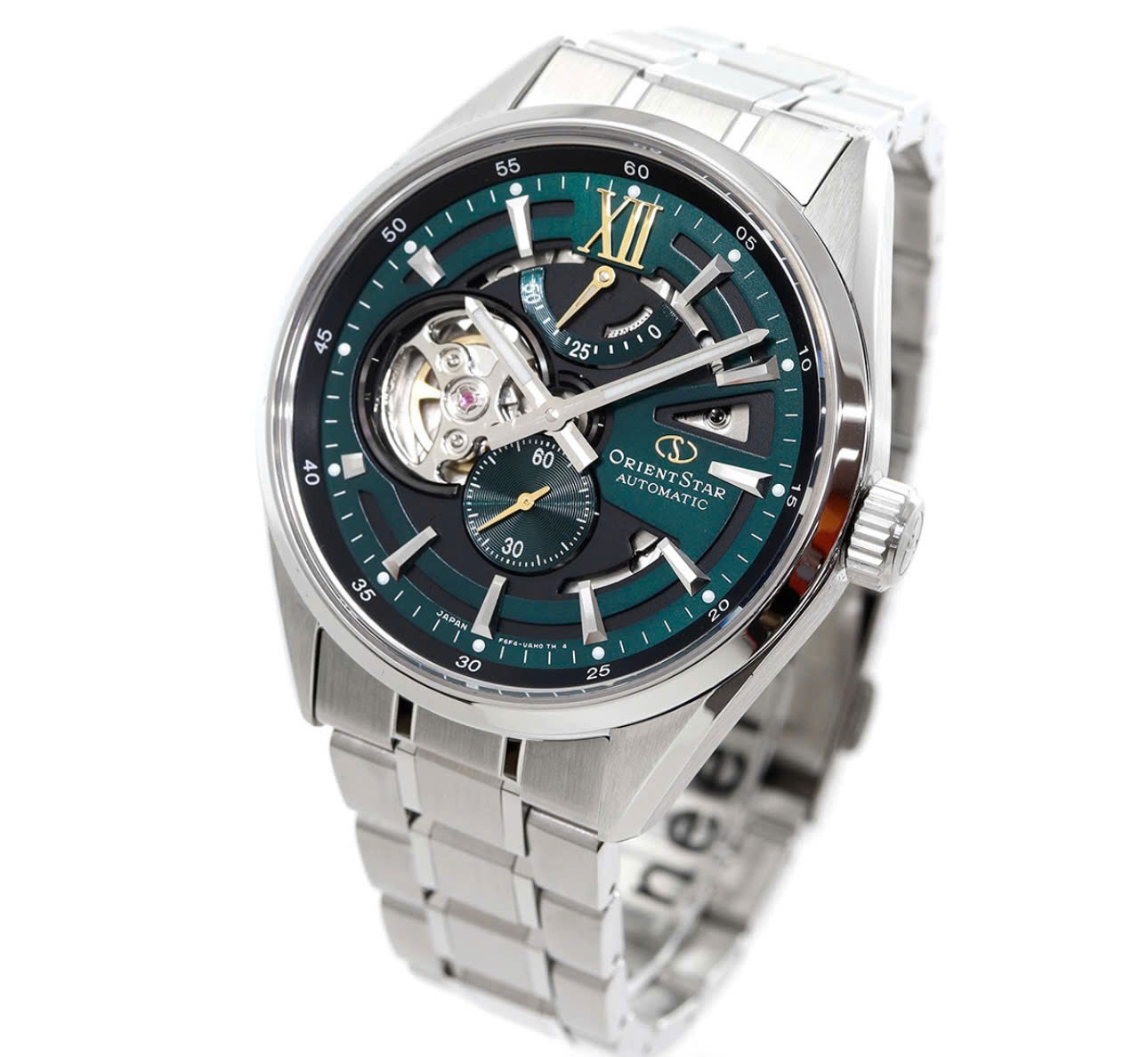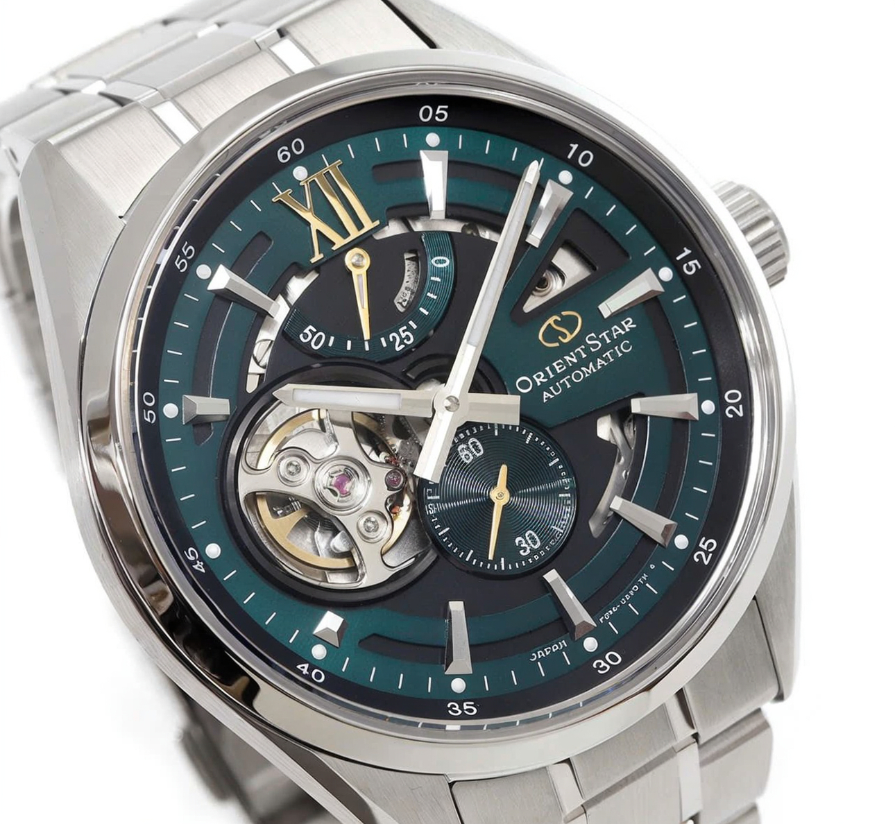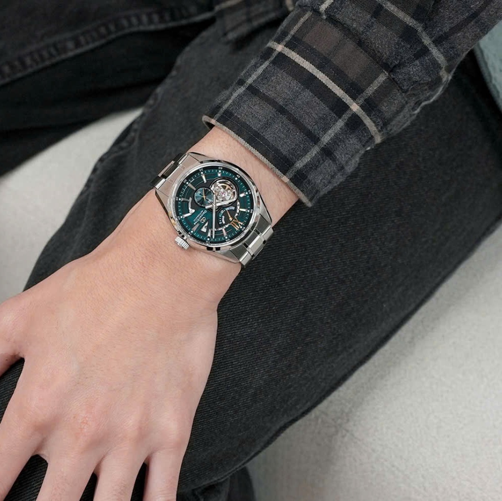 Дизайн: сталевий корпус + сталевий браслет + насичений зелений циферблат із напівскелетоном.