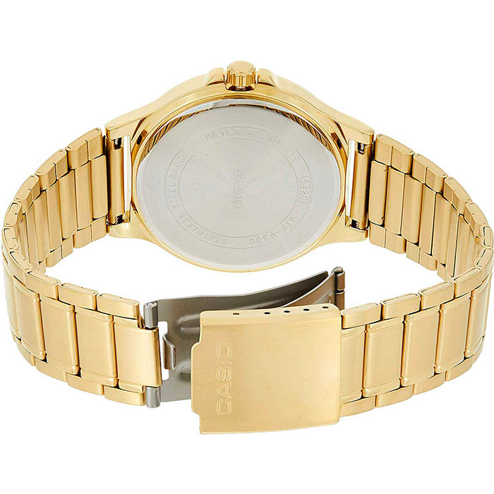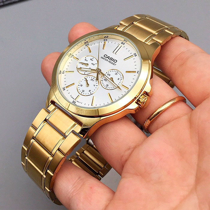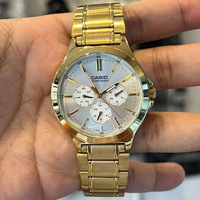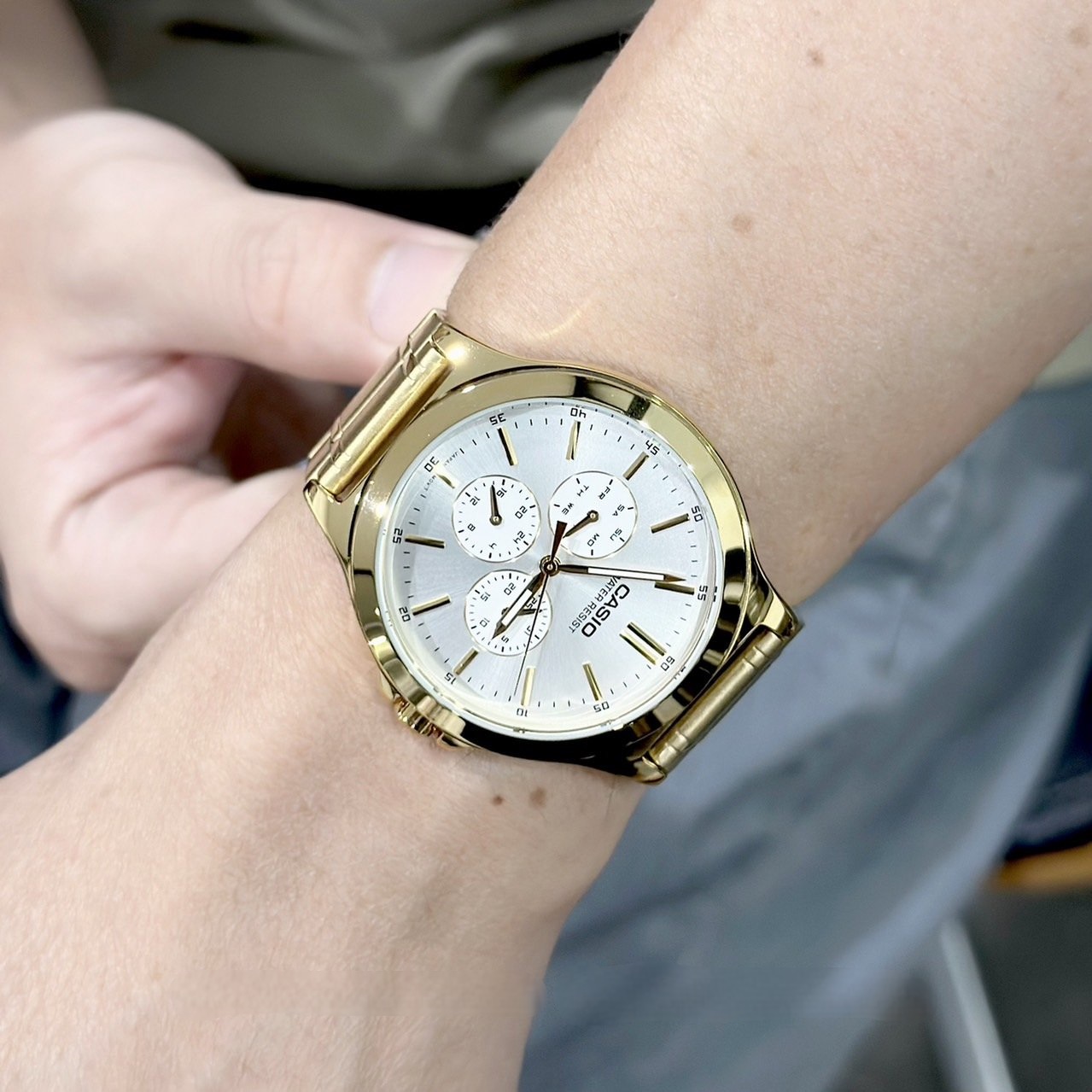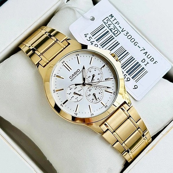 CASIO MTP-V300G-7AUDF — это настоящее воплощение классики с нотами благородного золота, где светлый перламутровый циферблат мягко сочетается с тёплым блеском золотистого корпуса и браслета. Модель словно создана для тех, кто ценит свет и элегантность в каждой линии. Три вспомогательных циферблата — день недели, дата и 24-часовая шкала — выполнены симметрично и лаконично, а золотистые стрелки и метки красиво играют на свету при каждом повороте запястья.